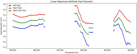 Detailed view of processed pupil diameter data after applying linear regression to predict the mean pupil diameter. The graph plots left pupil (blue line), right pupil (red line), and mean pupil diameter (green line) over timestamps.