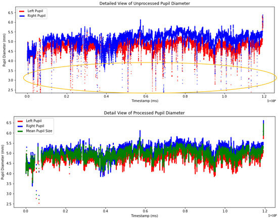 Two plots comparing pupil diameter measurements before (left) and after (right) the application of outlier removal techniques are presented in Figure 5. The blue dots represent pupil diameter measurements, while the circled area highlights the sudden decrease in pupil diameter. Such irregularities likely happened due to blinking, tracking errors, sudden obstructions or head movement. After outlier removal, the right graph (Figure 5) presents a cleaner representation of pupil diameter changes.
