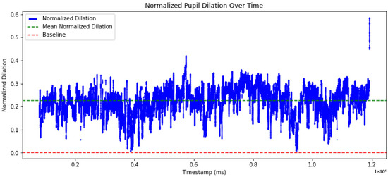 The graph shown in Figure 10 presents the normalized pupil dilation over time. The normalized pupil diameter is represented by the blue line indicating fluctuations in dilation over time. The green dashed line indicates the mean normalized dilation. The red dashed line represents the baseline, corresponding to a neutral reference level.