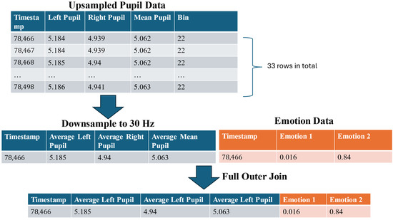 To integrate the two datasets, a full outer join was applied to merge all rows from the multimodal data. For this paper, this approach integrated the facial expression and pupil diameter data, preserving all time points from both datasets (Figure 11).