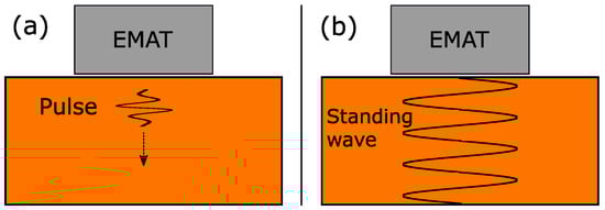 Illustration of EMAT operating methods. (a) Pulse-echo method: A short pulse is emitted and caught again by the EMAT. By measuring the ToF of the wave packet, the thickness is estimated. (b) EMAR method: A standing wave is implied beneath the EMAT, where the thickness can be estimated from the resonance frequency.