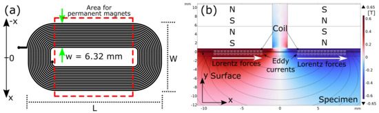 (a) Top view of racetrack coil configuration used for the EMAT. Each track spans a width of mm. The red dotted square marks the area where the magnets are positioned. (b) 2D-Illustration of Lorentz force generation. A cross-section of the EMAT, including the racetrack coil and magnets on top, which provide the constant magnetic flux density, is shown. The color indicates the magnetic flux density in y-direction.