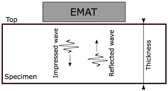 The EMAR method assumes a standing wave along the thickness of the sample [12]. This standing wave is formed by a generated wave traveling along the thickness and is constantly reflected at the top and bottom of the specimen. For this measurement method, the EMAT is suitable as it generates the wave without mechanical contact to the specimen, and therefore, the reflection of the wave is not influenced by the transducer. Figure 3 shows an illustration of the theoretical reflection principle of ultrasonic waves. In resonance mode, the EMAT excites another wave just at the same time the first reflected wave arrives at the upper boundary.