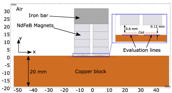 In order to verify the EMAR with respect to the thickness estimation of a copper block, a 2D simulation model is set up in COMSOL Multiphysics (Version 6.1). The finite element (FE) model is shown in Figure 5.
