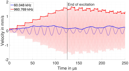 As described above, the main simulation result from the COMSOL domain is the step response of the system . It is convoluted with a sinusoidal excitation with frequencies from 40 kHz to 1 MHz. The output of this convolution represents the amplitude of the copper particle velocity within the ultrasonic wave. An exemplary result of two convolutions at the first and 16th resonance frequency with a sinusoidal current (amplitude of 1 A) is shown in Figure 6.