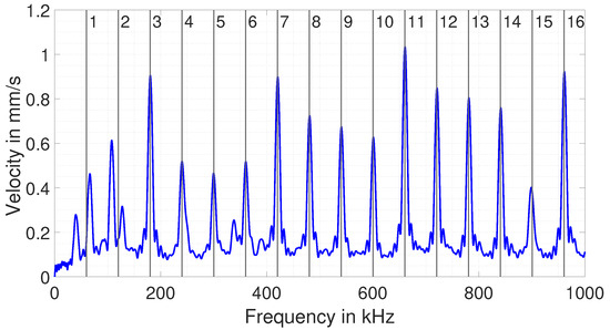 Although both frequencies theoretically meet the EMAR condition, only the excitation at the 16th resonance frequency adds up nicely during excitation time and then remains high for the rest of the time. In the case of the first resonance frequency, the signal does not add up much, and thus, after the end of excitation, it is lower by a factor of 8 compared with the higher frequency. The reason for this is addressed later on in this section. In order to compute the EMAR spectrum from the convolution, the part of the signal from 125 μs to 250 μs (time range in which the excitation is already over) is transferred into the frequency domain for every excitation frequency and one obtains the desired EMAR spectrum. The spectrum from the simulation is shown in Figure 7.
