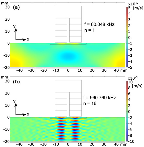 To analyze the directivity, the simulated wave motion of the propagating wave is illustrated at a certain point in time. Hereby, the first and 16th resonance frequency are examined. Figure 8 shows the simulated standing wave motion (x-velocity) along the block thickness for the two frequencies at 15.85 μs. This point in time is chosen as the wave was already reflected back once from the bottom of the block and is propagating towards the top again.