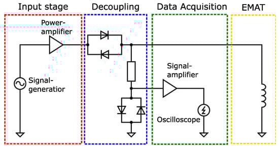 - Reduced supply voltage: As the EMAT consists of a coil, the overall impedance, and therefore, the required excitation voltage, is lower when the operation frequency is decreased. Indeed, as will be demonstrated in this work, EMAR is successfully operated at voltages below 60 V.
