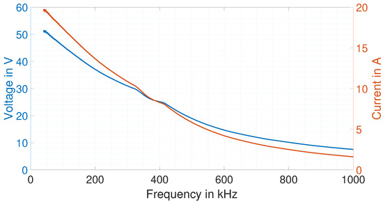 Measured current amplitude during the EMAT excitation and corresponding calculated voltage provided by the power amplifier.