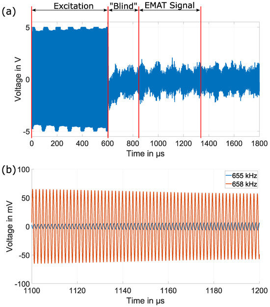 During excitation, the output of the amplifier is driven into saturation. After the excitation, there is a “blind” window of about 250 μs where no measurements are possible due to necessary signal settling. After 850 μs, the EMAT signal is measured. As can be seen, the EMAT signal is quite noisy, but additional signal post-processing, including filtering operations, will help to extract the necessary information for the EMAR operation.