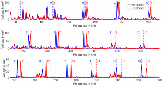 In blue, the spectrum of the mm copper block is plotted, and in red, the spectrum of the mm block is shown. The spectrum is divided into three single spectra for better illustration. In the first row, the frequencies from 40 kHz to 320 kHz are plotted. Within this frequency range, the first five resonance frequencies are contained. The second row, ranging from kHz to 640 kHz, includes the resonance frequencies number 6 to 10. The third row contains the last six resonance frequencies from number 11 to 16. Each row also contains the predicted resonant frequencies for the mm thick copper block and for the mm block. The predicted resonances are numbered vertical dashed lines in the corresponding color for each specimen. The number marks the nth predicted resonance frequency. What can already be seen is that the maximum peak height of the measured resonances decreases for increasing frequency (Please note the different vertical axis scaling). This is due to the limitations of the power amplifier, leading to decreasing current at higher frequencies.
