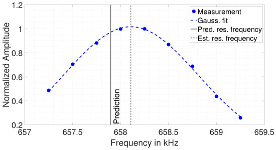 As can be seen, the Gaussian fit matches the measured resonance peak well. The peak’s frequency is evaluated and used for the thickness estimation. Further, in this figure, the predicted resonance frequency is also plotted. It is clearly visible that the found resonance frequency is shifted compared with the actual predicted resonance frequency. It is interesting to note that all nine measuring points together form a “nice” resonance curve that is perfectly fitted by the Gaussian curve. Therefore, this shift in frequency is not due to an outlier, but must occur from some “systematic” behavior. Probably still the influence of a certain eigenmode, but it could also be some frequency-dependent material behavior affecting the actual shear wave speed compared with the mean velocity of .