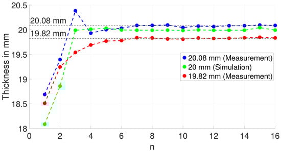 The measurement shows that the estimated thickness for both blocks significantly differs from the true thickness values for resonance frequencies n < 6. As shown in the simulation results (Figure 8a), this is due to the poor directivity of the excited ultrasonic wave within this frequency range. For higher frequencies (n > 6), the estimated thickness approaches the true value, as the directivity towards the bottom of the block increases. Similar to the measurement, the simulation also approaches the true thickness value of 20 mm once the third or higher frequencies are taken. Most probably, this is due to the fact that the third spatial dimension is missing in the simulation. Therefore, no additional eigenmodes from this third missing dimension interact with the thickness resonances.