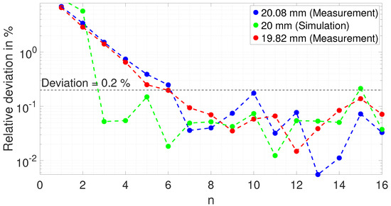 As with the measurements shown, the relative deviation decreases exponentially from around 8 % to about % for resonant frequencies 1 to 6. For higher resonance frequencies, the deviation stays below %. The deviation of the simulation shows a similar behavior except that the deviation already remains below % for resonance frequencies n ≥ 3.