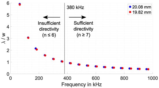 As can be seen, the ratio decreases with increasing frequency. The ratio is 1 at about 380 kHz. If the ratio is higher, which corresponds to the operation of EMAR at resonant frequencies 1 to 6, the thickness deviation is high due to the weak directivity of the wave, as shown in Figure 16. Increasing the operating frequency (n > 6) and consequently reducing the ratio to values below 1 increases the directivity, making EMAR suitable for thickness estimation.