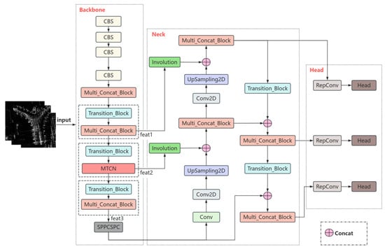 In the backbone network, f e a t 1 R 512 80 80 is a low-level feature map that provides rich spatial details of the object, which is helpful for object localization. f e a t 3 R 1024 20 20 is a high-level feature map in which f e a t 2 R 1024 40 40 encodes abstract semantics for distinguishing the foreground and background.