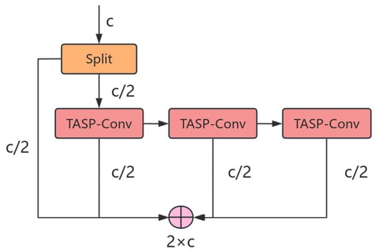 The structure of the MTCN module is shown in Figure 2, which is mainly composed of TASP-Conv modules. The input features are divided into two parts by the split operation. One part retains the original features to avoid information loss, and the other part enters the TASP-Conv module for further feature extraction. Considering the multi-scale characteristics of aircraft, a three-layer TASP-Conv module is used to cover the semantic granularity from coarse to fine.