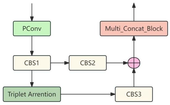 The TASP-Conv module is shown in Figure 3. In order to not increase the number of calculations, the input features are subjected to PConv convolution operation, and then the number of channels is expanded through CBS1 to maintain the feature diversity of the incoming target attention module (TAM) [28] and achieve lower delay. The features processed by the TAM are adjusted back to the original number of channels by CBS3 and connected with the features adjusted by CBS2 through the Concat channel before being passed to Multi_Concat_Block for multi-scale feature extraction.