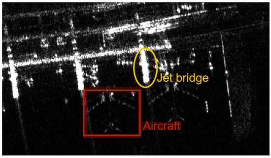 As shown in Figure 6, the highly reflective strong echoes from metal facilities such as the jet bridge can form bright areas with strong scattering similar to aircraft targets. Meanwhile, the aircraft targets parked near the jet bridge appear relatively dim in the image. This complex electromagnetic scattering environment can severely interfere with the SAR echo signals of aircraft targets, increasing the difficulty of acquiring a precise target location.