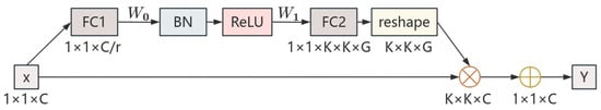 In the formula, X i , j represents a single pixel at coordinates (i,j) on the input feature map, W 0 R C / r C and W 1 R ( K K G ) C / r are linear transformation matrices, G denotes the number of groups, r is the channel reduction ratio which controls the scaling factor to adjust parameter quantity, and σ represents the intermediate BN and ReLU operations.