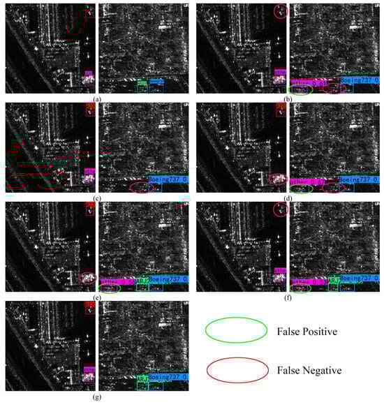 Figure 10 shows the aircraft recognition results of five kinds of networks in complex and large-scene SAR images. It can be seen that the SSD and YOLOv5 networks fail in this scene and fail to detect any aircraft targets, which seriously lacks the ability to locate targets in complex backgrounds. Due to the limitations of the fixed default box design and the multi-scale feature fusion mechanism, it is difficult to adapt the SSD network to the size change in the target in SAR images. However, the FPN + PAN feature pyramid structure adopted by the YOLOv5 network has a small number of feature fusion layers, which insufficiently captures the context information of small targets. Although the Faster R-CNN algorithm can detect parts of aircraft targets, due to the loss of small target feature information caused by RoI pooling operation in its two-stage detection process, there are serious missed detection problems in the detection results and a large number of invalid candidate regions. YOLOv8 can detect some targets, but it is not sensitive to strong scattering targets. In contrast, the YOLOv7-MTI network can accurately locate the position of the aircraft, extract the features of different types of aircraft, and achieve competitive detection performance.
