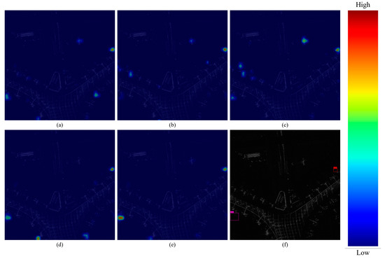 Figure 9. Heat map visualization. (a) + TAM; (b) + PConv (F); (c) + MTCN; (d) + involution; (e) YOLOv7-MTI; (f) label.