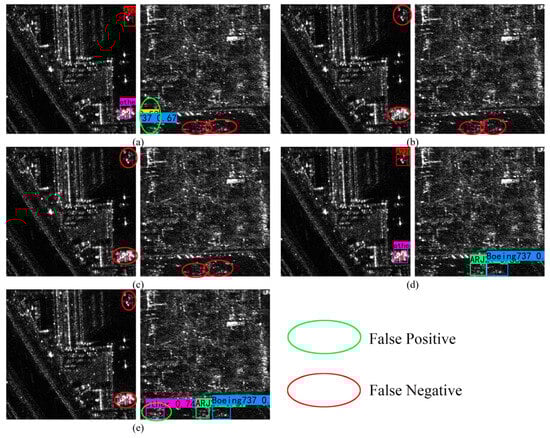 After adopting the MTCN module, the network improves the mAP, mPrecision and mF1. To further verify the effectiveness of the MTCN module, this study shows the recognition results of each module, as shown in Figure 8. Figure 8e shows the recognition results of + MTCN, which recognizes the missed weak scattering targets in Figure 8c,d and has high sensitivity to the weak scattering aircraft targets in SAR images; however, it misses the strong scattering targets. Figure 8f shows the recognition result of + involution, which can be seen to respond significantly to strong scattering aircraft targets in SAR images. When only involution is used in the neck part, the AP of the ARJ21 category reaches 96.81%. This is because ARJ21 shows the characteristics of short fuselage with strong scattering, and involution will dynamically generate compact nuclei to focus on the middle of the fuselage and highlight the target features. Compared with other modules, the mRecall of involution is improved to 96.08%, indicating the effectiveness of involution in highlighting aircraft features and alleviating complex background interference, and more aircraft targets can be detected.