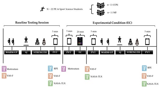 This randomized between-subjects study involved three visits: familiarization, baseline testing, and experimental condition (EC). Participants were randomly assigned to MF or CON conditions (Figure 1). Familiarization included procedural orientation. Pre-test instructions matched prior MF studies [], including 7+ h of sleep and abstention from stimulants or exercise. Laboratory conditions and testing time were standardized. Baseline testing began with self-reports of M-VAS and motivation [], followed by a dynamic warm-up. Participants completed squat jumps (SJ) [,], back strength testing using the Takei 5402 [,,], and handgrip testing [,], then performed a 5 min PVT. Finally, they completed M-VAS, RPE, and NASA-TLX scales. A week later, the EC session began with filling the motivation questionnaire and with a 5 min PVT. The MF group then performed a 20 min Stroop task (SOMA-NPT), while the CON group viewed a neutral documentary with minimal cognitive demand []. After the condition, participants repeated the PVT, self-ratings (M-VAS and NASA TLX), warm-up, and all physical tests in the same order and conditions as baseline. A final PVT and all self-report measures (RPE, M-VAS, NASA TLX) were completed at the end.
