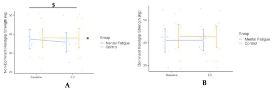 The reduction in non-dominant handgrip strength supports the hypothesis that MF disproportionately impairs tasks requiring greater cortical engagement. Jacquet et al. [] attributed similar impairments to neurophysiological changes—specifically reduced attention-related ERP components and increased alpha inhibition—which interfere with motor coordination and voluntary drive without affecting peripheral muscle activation. Additionally, asymmetries may reflect underlying cortical organization: the dominant hemisphere typically exhibits more efficient motor cortex activation, while the non-dominant side may rely on broader and more resource-intensive cortical recruitment. Under conditions of MF, attentional resources may become insufficient to support precise control of the less-practiced limb, increasing susceptibility to central performance decrements [,]. This finding aligns with the dynamic-dominance hypothesis proposed by Sainburg [], which posits that dominant and non-dominant limbs utilize distinct motor control strategies—predictive control in the dominant limb and feedback-driven control in the non-dominant. Under mental fatigue, these differences may be amplified, especially in tasks requiring precision or sustained attention. Furthermore, a growing body of evidence indicates that fatigue exacerbates inter-limb asymmetries in both biomechanical and performance metrics. For instance, Gao et al. [] demonstrated increased asymmetry in lower-limb joint mechanics following running-induced fatigue, highlighting altered symmetry angles in joint rotation and moment generation. Similarly, a systematic review by Heil et al. [] summarized evidence across multiple sports and exercise modalities, concluding that exercise-induced fatigue can lead to asymmetries that potentially elevate injury risk during dynamic, sport-specific actions.