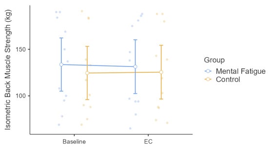 Isometric back strength was analyzed using a two-way mixed-design repeated-measures ANOVA. The Group × Time interaction was not significant, F(1, 20) = 2.76, p = 0.112, η2ₚ = 0.121, indicating no differential change between the Mental Fatigue and Control groups across time. The main effect of Time was also non-significant, F(1, 20) = 0.51, p = 0.484, η2ₚ = 0.025, showing no overall change in back strength from pre- to post-intervention. Similarly, the main effect of Group was non-significant, F(1, 20) = 0.15, p = 0.704, η2ₚ = 0.007, indicating comparable performance across groups (Figure 3).