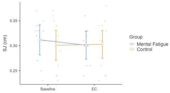 Effect of Mental Fatigue on Squat Jump (SJ). Note: Squat jump (SJ) performance (mean ± SE; measured in centimeters [cm]) for the Mental Fatigue (MF) and Control (CON) groups across sessions (Pre = baseline, EC = experimental condition). No significant Group × Session interaction, main effect of Session, or main effect of Group was observed. SJ = Squat Jump; MF = Mental Fatigue group; CON = Control group; EC = Experimental Condition.