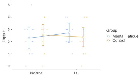 Psychomotor vigilance lapses were analyzed using a two-way mixed-design repeated-measures ANOVA. The Group × Time interaction was not significant, F(1, 20) = 1.38, p = 0.254, η2ₚ = 0.064, indicating no differential change between groups over time. There was no significant main effect of Time, F(1, 20) = 0.25, p = 0.621, η2ₚ = 0.012, nor a significant main effect of Group, F(1, 20) = 0.009, p = 0.926, η2ₚ < 0.001 (Figure 5).