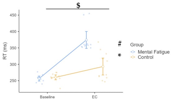 Effect on Psychomotor Vigilance (PVT) Reaction Time (RT). Note: Psychomotor vigilance reaction time (RT; mean ± SE, in milliseconds) for the Mental Fatigue (MF) and Control (CON) groups across sessions (Pre = baseline, EC = experimental condition). A significant Group × Time interaction ($ p < 0.05), a significant main effect of Time (* p < 0.05), and a significant main effect of Group (# p < 0.05) were observed. Symbols indicate: $ = significant condition × time interaction; * = significant main effect of time (Session); # = significant main effect of condition (Group). MF = Mental Fatigue group; CON = Control group; EC = Experimental Condition.