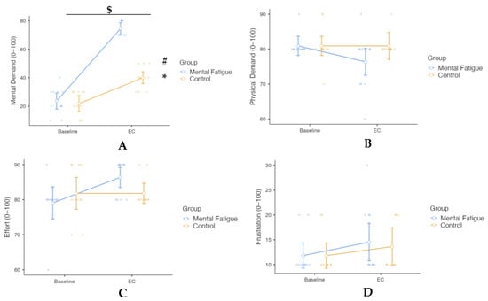 Effect of Mental Fatigue on NASA-TLX scale: Mental Demand (A); Physical Demand (B); Effort (C); Frustration (D). Note: NASA-TLX subscale ratings (mean ± SE, scale 0–100) for the Mental Fatigue (MF) and Control (CON) groups across sessions (Pre = baseline; EC = experimental condition). Symbols indicate: $ = significant Group × Session interaction; * = significant main effect of Session (time); # = significant main effect of Group (condition). MF = Mental Fatigue group; CON = Control group; EC = Experimental Condition. (A) Mental Demand: A significant Group × Session interaction ($ p < 0.05), a significant main effect of Session (* p < 0.05), and a significant main effect of Group (# p < 0.05) were observed. (B) Physical Demand: No significant Group × Session interaction, main effect of Session, or main effect of Group. (C) Effort: No significant Group × Session interaction, main effect of Session, or main effect of Group. (D) Frustration: No significant Group × Session interaction, main effect of Session, or main effect of Group.