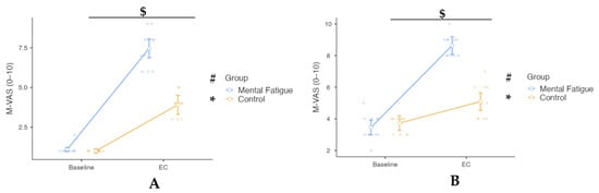 Subjective mental fatigue (M-VAS) ratings across experimental phases. Note: M-VAS ratings (mean ± SE, scale 0–10) for the Mental Fatigue (MF) and Control (CON) groups across sessions (Pre = baseline; EC = experimental condition). Symbols indicate: $ = significant Group × Session interaction; * = significant main effect of Session (time); # = significant main effect of Group (condition). MF = Mental Fatigue group; CON = Control group; EC = Experimental Condition. (A) M-VAS ratings from baseline compared to ratings immediately after the experimental cognitive task (Stroop test), used to induce mental fatigue (manipulation check). A significant Group × Session interaction ($ p < 0.05), a significant main effect of Session (* p < 0.05), and a significant main effect of Group (# p < 0.05) were observed. (B) M-VAS ratings from baseline (after all physical performance tests) compared to ratings immediately after the post-intervention condition (post-mental fatigue or control exposure and subsequent physical performance tests). A significant Group × Session interaction ($ p < 0.05), a significant main effect of Session (* p < 0.05), and a significant main effect of Group (# p < 0.05) were observed, reflecting a greater increase in subjective mental fatigue in the MF group compared to the CON group.