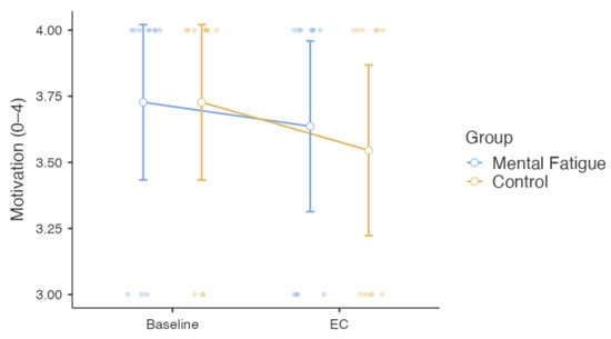 Motivation Levels. Note: Motivation ratings (mean ± SE) for the Mental Fatigue (MF) and Control (CON) groups across sessions (Pre = baseline; EC = experimental condition). No significant Group × Session interaction, main effect of Session, or main effect of Group was observed. MF = Mental Fatigue group; CON = Control group; EC = Experimental Condition.