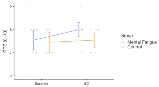 Effect of Mental Fatigue on Rating of Perceived Exertion (RPE). Note: RPE (mean ± SE, scale 0–10) for the Mental Fatigue (MF) and Control (CON) groups across sessions (Pre = baseline; EC = experimental condition). No significant Group × Session interaction, main effect of Session, or main effect of Group was observed. MF = Mental Fatigue group; CON = Control group; EC = Experimental Condition.