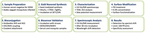 The eight-step process includes sample preparation, gold nanorod synthesis, characterization, surface modification with PEI, antibody bioconjugation, biosensor validation, spectroscopic analysis, and results interpretation. The method achieves a detection limit of 100 PFU/mL for DENV, ZIKV, and other orthoflaviviruses through localized surface plasmon resonance (LSPR) monitoring (Figure 1).