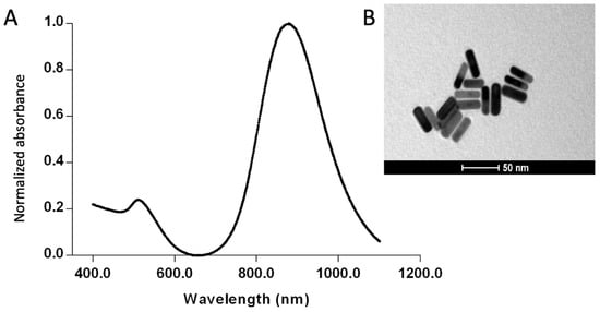 Characterization of the synthesized gold nanorods (GNRs). (A) UV-Vis/NIR absorption spectrum, (B) transmission electron microscopy image of the GNRs.
