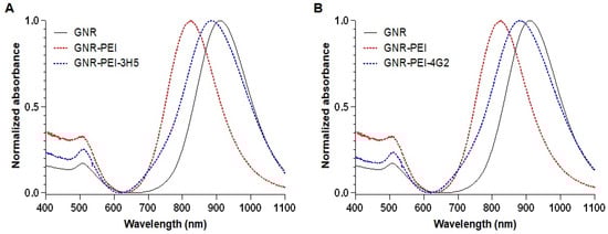 UV-Vis/NIR spectra of the GNR functionalization steps. (A) Functionalization with 3H5 antibody. (B) Functionalization with 4G2 antibody.