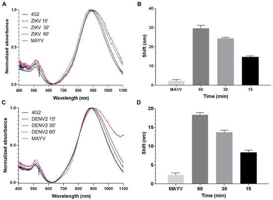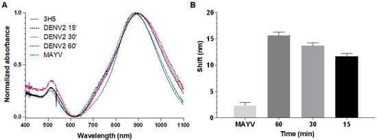 Initially, we assessed the detection times of the biosensors by incubating them with DENV or ZIKV for 15, 30, and 60 min. After 15 min of incubation at room temperature, virus detection on the biosensors was observed, with a longitudinal plasmonic peak shift of approximately 10 nm (Figure 4 and Figure 5). The specificity of the signal was confirmed because the biosensors could not recognize MAYV (negative control). Biosensor-4G2 showed better sensitivity for ZIKV detection. In this case, a shift of approximately 20 nm was recorded in the first 15 min and up to 30 nm after one hour of incubation.