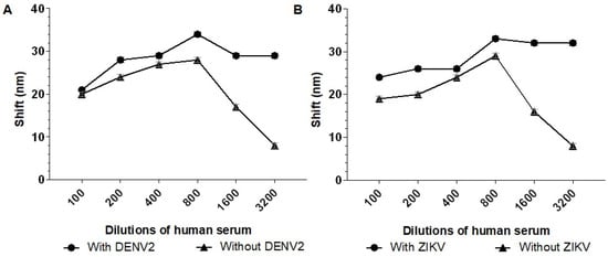 Next, we aimed to identify the serum dilution that minimized interference from nonspecific binding. To achieve this, the biosensors were tested with serum dilutions of 1:100, 1:200, 1:400, 1:800, 1:1600, and 1:3200 in the presence and absence of 103 PFU/mL of either DENV or ZIKV.