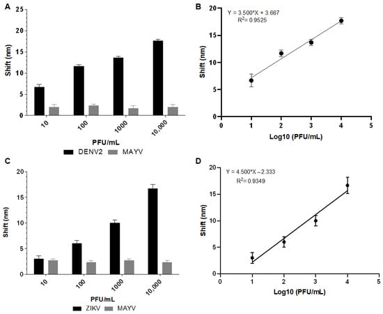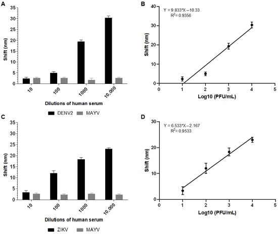 The serum dilution 1:3200 showed better results for both biosensors, with shifts of 21 nm (Biosensor-3H5) and 20 nm (Biosensor-4G2) in the negative serum. Therefore, a 1:3200 serum dilution was chosen to evaluate the detection limit of the biosensor in the presence of different virus concentrations and to evaluate the influence on the specificity of the biosensors when incubated with serum and MAYV (Figure 6).