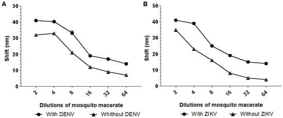 Absorption plasmon spectrum shifts of the biosensors (A) Biosensor-3H5 and (B) Biosensor-4G2 in different dilutions of mosquito macerate. The biosensors were tested with different dilutions of human serum (1:2, 1:4, 1:8, 1:16, 1:32, and 1:64) with or without the addition of 103 PFU/mL of DENV/ZIKV. Each point represents the mean of triplicates; error bars denote standard deviation.