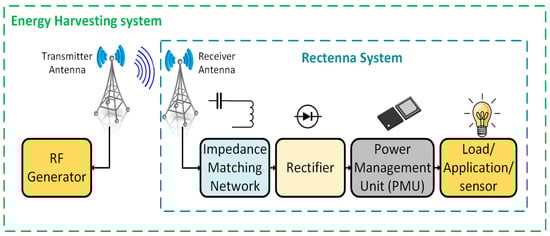 The rapid development of 5G technology, the Internet of Things (IoT), the fourth industrial revolution, and smart city ecosystems has intensified the demand for autonomous, battery-free devices capable of operating in energy-constrained environments [,,]. IoT networks have billions of sensors utilized for environmental monitoring, industrial automation, and healthcare, which require sustainable power solutions to overcome the limitations of conventional batteries, such as their finite lifespan, maintenance costs, and environmental hazards []. Wireless power transfer (WPT) and RF energy harvesting (RFEH) have emerged as transformative technologies, enabling devices to scavenge energy from ambient electromagnetic signals emitted by Wi-Fi routers, cellular towers, and IoT transceivers [,,]. Figure 1 shows the main components of WPT and RFEH []. The antenna plays a crucial role in both systems, where the receiving antenna at the RFEH system captures ambient radio frequency signals from the environment for energy harvesting.