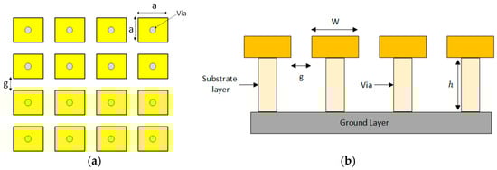 There are many shapes of EBG structures used to suppress surface waves. Among them, the mushroom-shaped EBG structure exhibits a distinct stopband effect for surface-wave propagation. This structure consists of four main components: a ground layer, a substrate layer, a patch layer, and via, as shown in Figure 3a. The side view of the mushroom-shaped EBG structure is illustrated with its dimensions in Figure 3b.