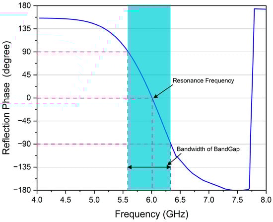 The bandwidth of the EBG structure is defined as the frequency range where the reflection phase () lies between +90° and −90°; this condition ensures that the surface behaves as an EBG structure, suppressing surface waves and supporting the desired electromagnetic properties. In addition, reactance () must lie within this range between for the EBG structure to exhibit the desired bandwidth.