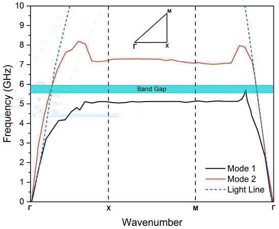 The typical dispersion diagram is a graphical method of wavenumber (k) versus frequency, utilized to determine the surface wave propagation characteristic of the EBG. The Eigen mode solver is a powerful method employed to obtain the dispersion diagram. Different modes propagate when the antenna is excited. Nevertheless, the higher modes will not propagate in the band-gap region. Figure 6 illustrates the dispersion diagram for the EBG structure at the desired frequency band []. Using the CST Microwave Studio, the dispersion diagram of a unit cell in the EBG structure is plotted to identify the frequency band gap. The EBG structure’s band gap was adjusted by adjusting W and g to accommodate the operational frequency.