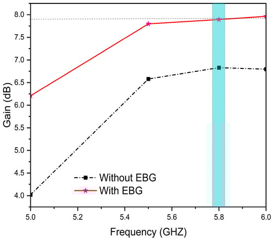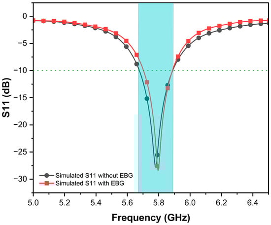 The reflection coefficient of the proposed EBG-based antenna was simulated by CST to assess impedance matching at the resonance frequency of 5.8 GHz. The EBG-based antenna achieved a good S11 of −27.9 dB, compared to −26.4 dB for the conventional antenna design. This improvement highlights the role of the EBG structure in reducing reflections and optimizing impedance matching, as shown in Figure 7. The EBG antenna demonstrates a −10 dB bandwidth of 188 MHz as it appears in blue shadow, which is narrower than the conventional antenna’s 215 MHz bandwidth. EBG structures typically decrease antenna bandwidth due to their inherent frequency-selective behavior. However, because EBGs operate effectively only within a narrow frequency range, they inherently limit the antenna’s bandwidth. This trade-off is often acceptable in applications prioritizing efficiency, isolation, or directivity over narrow operation. In special cases, EBGs may marginally improve the bandwidth when optimized to suppress interference or enable miniaturization.