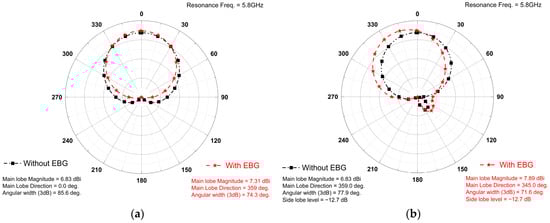 The radiation characteristics of the EBG-based antenna were analyzed in both the E-plane and H-plane at the resonance frequency for both antennas, as shown in Figure 8.